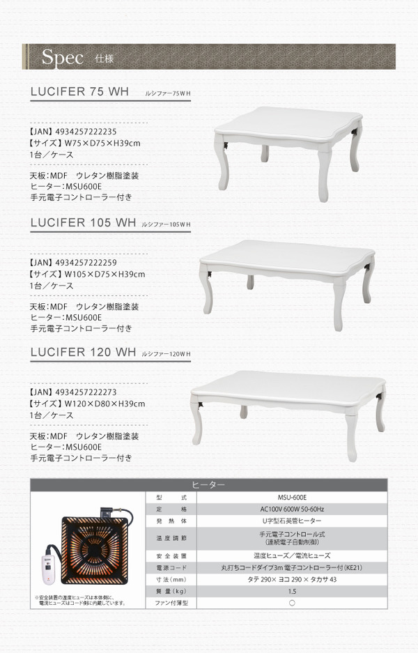 【成分材質】天板:MDF 塗装:ウレタン樹脂塗装 ヒーター:MSU-600E(N) 石英管ヒーター(手元電子コントローラー)